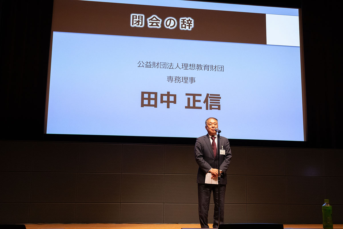 閉会にあたり、当財団の田中正信専務理事が「本日は素晴らしいお話を聞かせていただき、ありがとうございました。私自身も学ばせていただきました。本日の実践報告やワークショップでも取り上げられた『1枚ノート』は、今後、財団の助成品として先生方に提供できるよう、公式ガイドブックの制作を含め、準備を進めているところです。子どもたちにより良い教育ができるよう、今後も努めてまいります。本日はありがとうございました」と述べました。