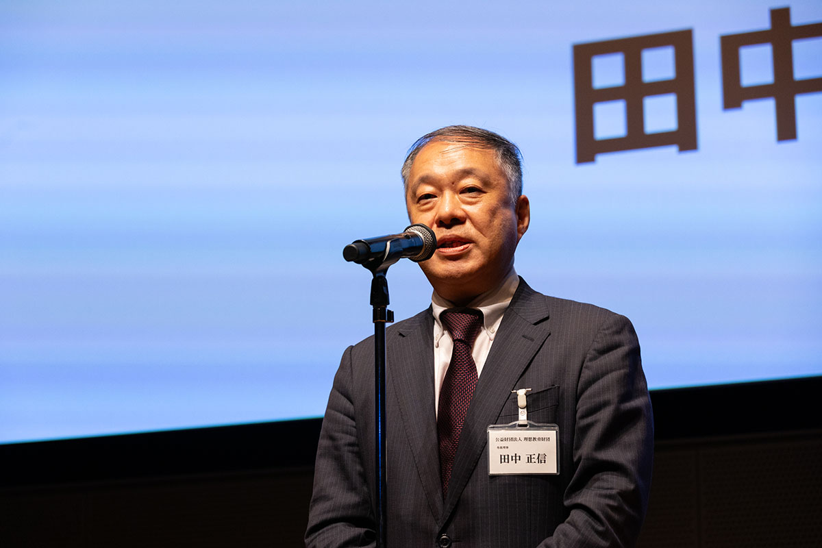 開会に先立ち、当財団の田中正信専務理事は、財団の事業内容や財団設立の背景について述べるとともに、「子どもたちの読み解く力が弱体化している」と、現状の教育の課題を指摘。今回の教育フォーラムにおいて「読み解く力や書くこと」に焦点を当てた狙いを説明した上で、「私も皆さま方と共に学んでまいりたい」とあいさつしました。