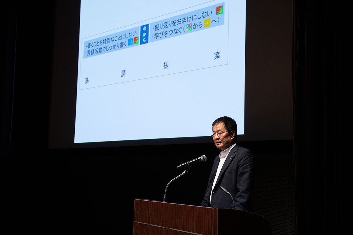 基調提案「読むために書く 学びをつなぐために書く『1枚ノート』の活用のてびき」では、達富洋二先生は、まず「日常的に文章を書く」「言語活動の中でしっかり書く」「振り返りをおまけにしない」「学びをつなぐ」の四つの取り組みの実践を会場の先生方に提案。併せて、書くことの充実に向けて、青木幹勇先生が提唱した「第一の書く」(書写)、「第二の書く」(作文)、「第三の書く」(言語活動として書く)に加えて、達富先生自身が考案した「第四の書く」(自分の学びを自覚するために書く)の内容を説明しました。