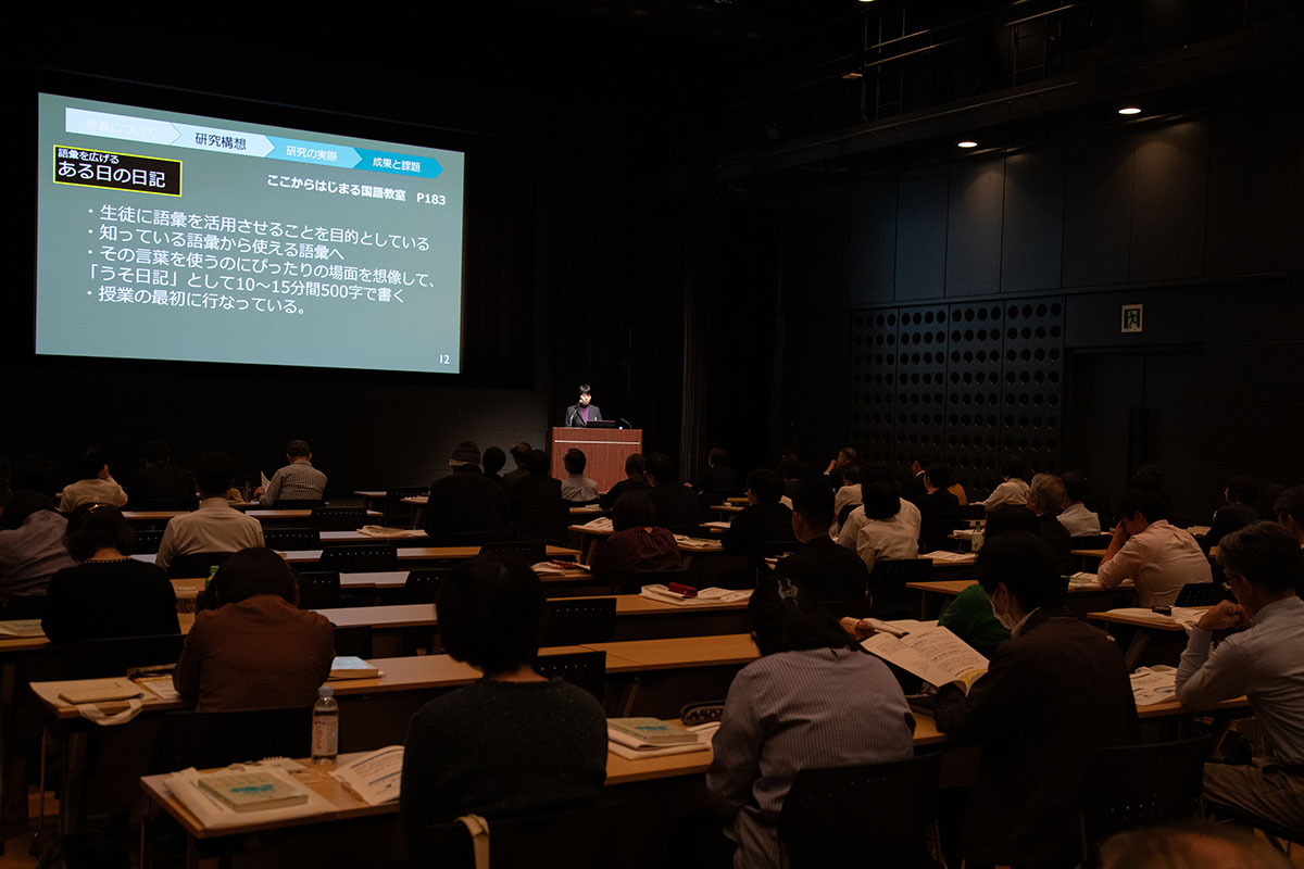 その上で、「生徒が明確な目標と学びの見通しを持って、学習に取り組むことができた」「自分の学びを自覚することで、身に付いた力を次の学びに生かそうとする姿が見られた」など、成果も強調。3年間にわたり取り組んだクラスでは、全国学力・学習状況調査の国語の通過率(正答率)が全国平均より約3ポイント高かった点も紹介しました。最後に、「学びに浸る生徒の姿から私も謙虚に学び、生徒たちと共に授業をつくっていける教師でありたい」と今後の抱負を述べました。