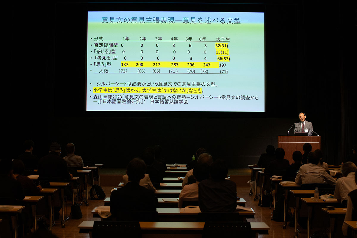 まとめ「おわりに-書く力・読む力のために」では、森山卓郎先生は、全国学力・学習状況調査の国語の問題などを例に、つなぎ言葉(接続詞)や「~と思う」などの表現の多様性とそれぞれの意味の違いを説明。子どもたちの表現の幅を増やし、書く力を高めるためにも、「今日はこういう言葉を使ってみよう」「段落を分けて書いてみよう」など、付けたい力を焦点化して、コンパクトに書く指導を繰り返すことの有効性を強調しました。