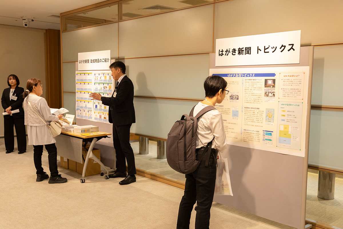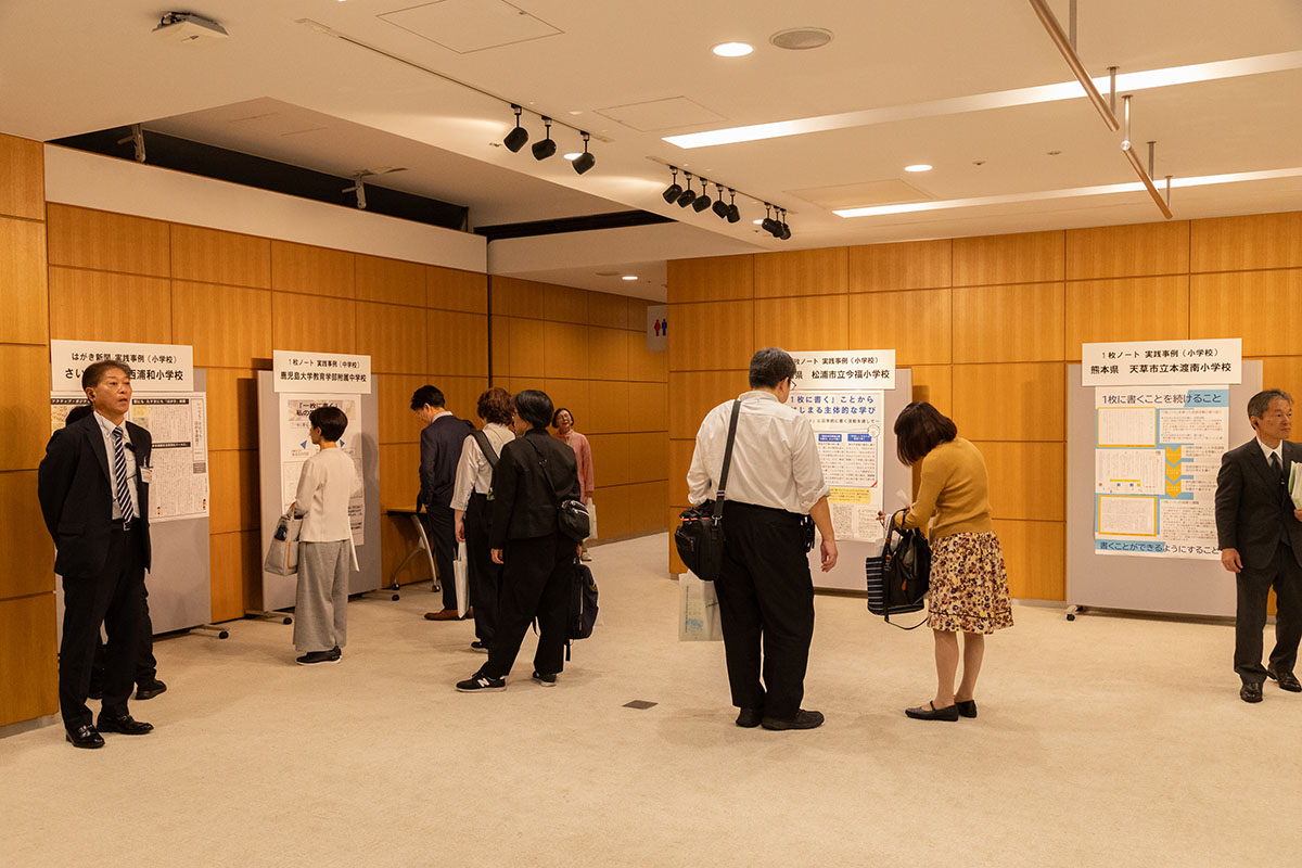 フォーラム会場ロビーには、「1枚ノート」や「はがき新聞」などの実践例が多数掲示され、参加者の関心を集めていました。
