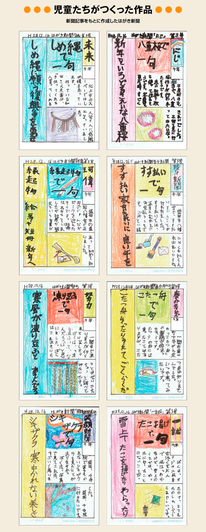 2016年は、行事や総合的な学習を含め、はがき新聞を4回作成。12月には「季節(冬)の言葉を学ぶ」として、俳句を交えたユニークなはがき新聞づくりを実践。俳句のテーマやキーワードになる言葉を新聞記事から捜すという新聞教育と連動した取り組みで、理想教育財団の俳句専用原稿用紙を使用し、左のスペースに俳句、右側にその背景や思いを70~80字で書き入れます。